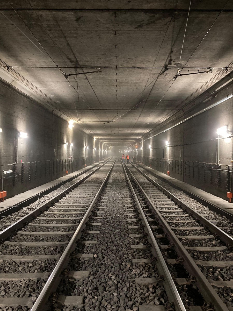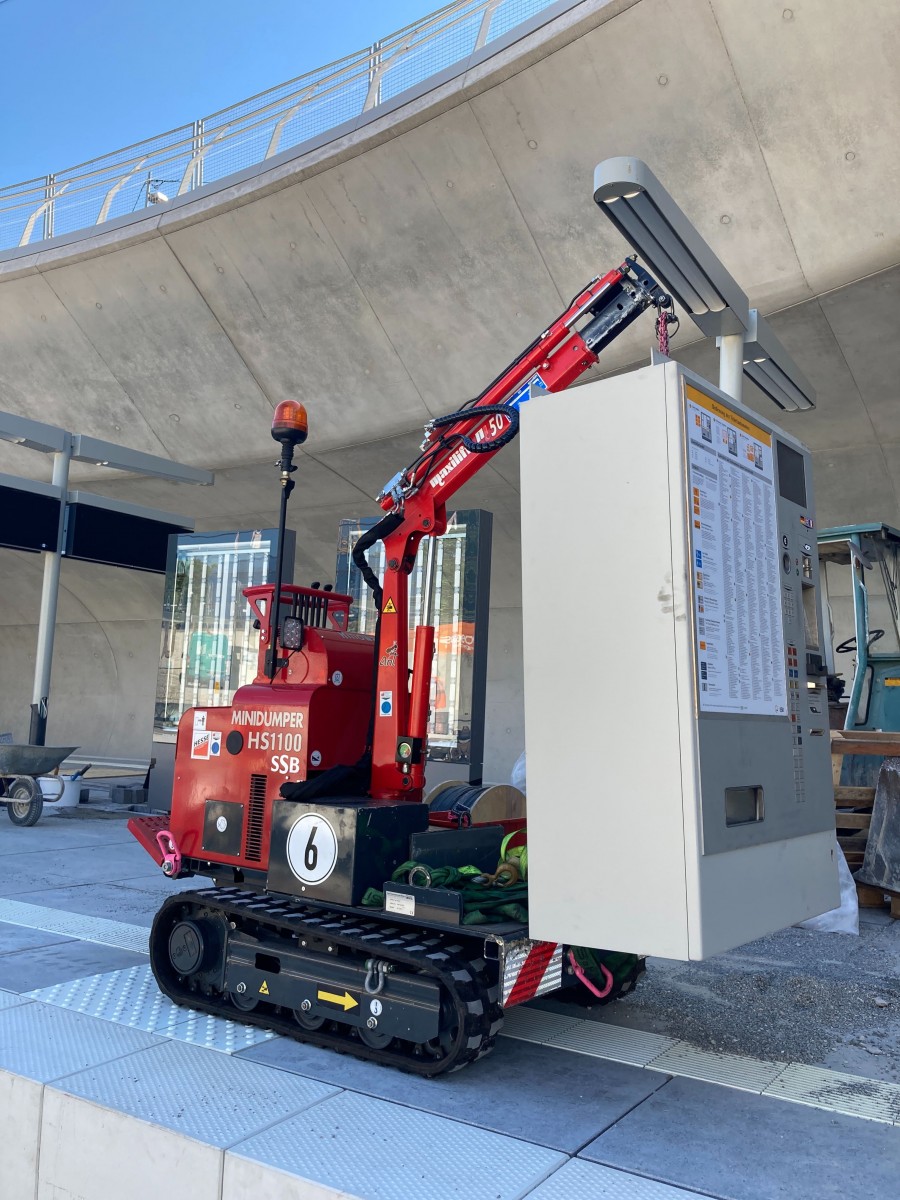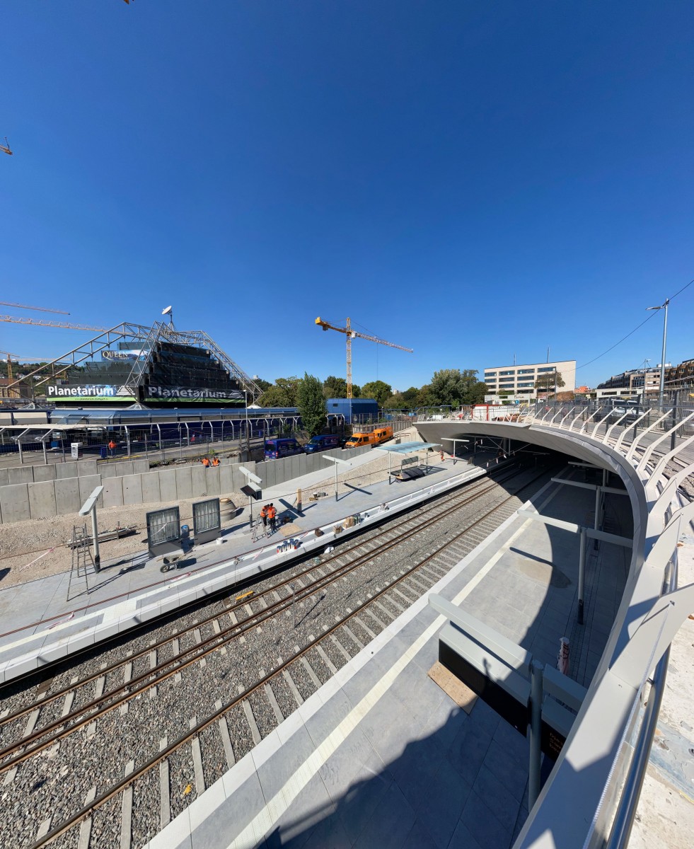 Nach sechs Jahren Bauzeit fand die Inbetriebnahme endlich am 12. September 2020 statt. Nur eine Woche vorher wurde die alte Haltestelle vom Netz abgehängt, um die notwendigen Umschlussarbeiten wie Weicheneinbau, Schottereinbringung, Fahrstromversorgung und so weiter durchzuführen. Ein "knappes Timing" würde man heute sagen – aber es hat alles nach Zeitplan geklappt und die neue Haltestelle erstrahlt in hellem Glanz.Kurz vor Fertigstellung – und mit Planetarium im Hintergrund.
