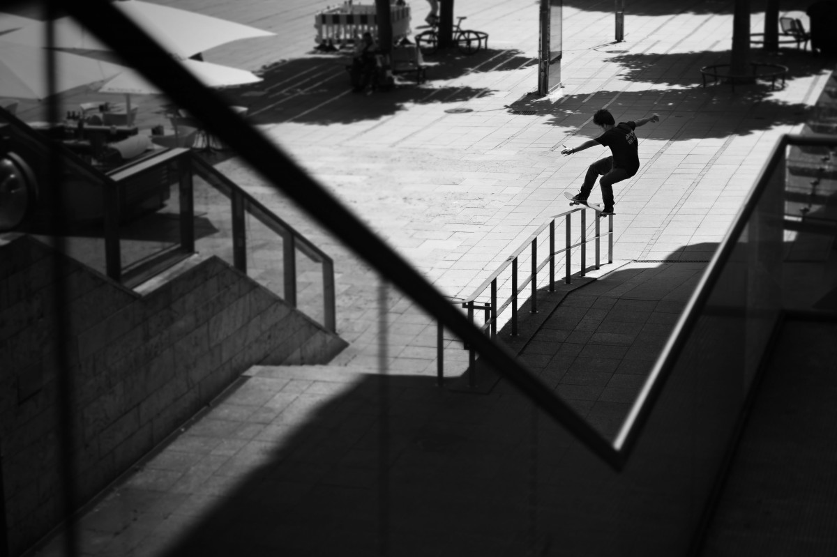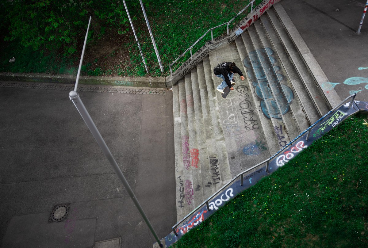 Minidrones. Das sind ungewöhnlich kleine Fotodrohnen, die es dem Piloten erlauben, besonders wendige Manöver zu fliegen oder sogar in engen geschlossenen Räumen fantastische Aufnahmen aus der Luft zu machen. Seine Drohne hat er jetzt immer dabei, wenn er loszieht, um Skateboardfotos zu schiessen. Eine kleine Auswahl seiner Arbeiten in Stuttgart aus der Luft und vom Boden seht ihr in unserer Photo Love Story.