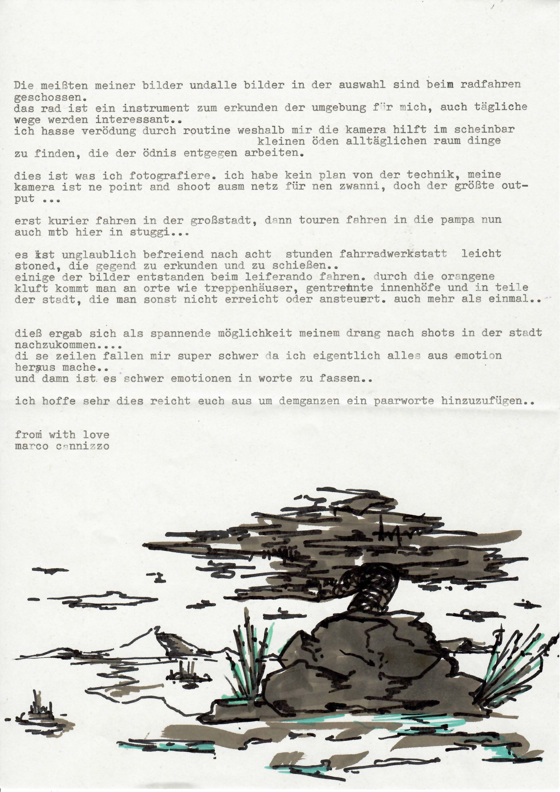Marco Cannizzo hat als Fahrradkurier einen sehr natürlichen und alltäglichen Umgang mit seiner Heimatstadt – und den vielen kleinen und versteckten Fotomotiven, die ihm auf seinen Touren begegnen. Wie versteckte Juwelen und unbeachtete Schönheiten inszeniert er die alltäglichen Erlebnisse und schenkt den Orten und Flecken in Stuttgart Aufmerksamkeit, die sonst neben den üblichen Sehenswürdigkeiten der Landeshauptstadt keine Beachtung finden.