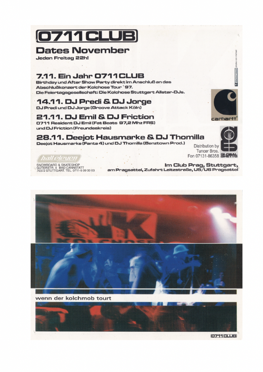So manche Stuttgarter:innen munkeln, dass hier der deutsche Hip-Hop mitbegründet wurde: Der 0711 Club. Mit zwei Events pro Monat startete die Partyreihe 1996, nur wenige Jahre später reisten Fans extra aus Frankreich oder Spanien an, um Künstler:innen wie Freundeskreis, Afrob oder die Massiven Töne performen zu sehen. Logisch, dass die Flyer vom 0711 Club ziemliche Hingucker sind! Nächstgelegene Bus-/Stadtbahnhaltestelle: Heilbronner StraßeInner Rhythm Club – Stadtmitte