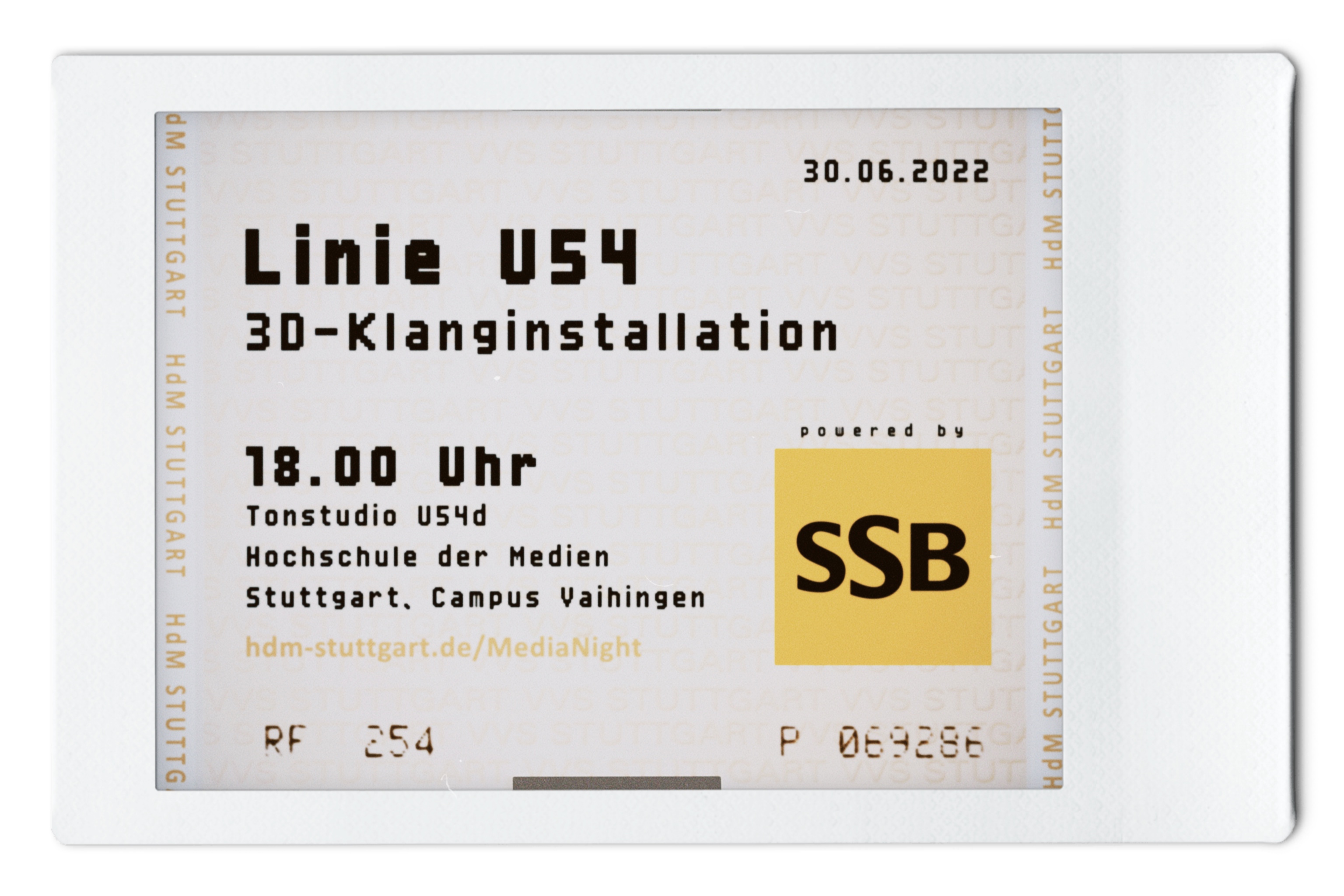 Wie unterschiedlich dieses individuelle Klangerlebnis wahrgenommen wird, hat eine Studierendengruppe des Masterstudiengangs „Audiovisuelle Medien“ der Hochschule der Medien in Stuttgart in ihrem Abschlussprojekt „Linie U54“ reproduziert und bei der hochschuleigenen Media Night am 30. Juni der Öffentlichkeit vorgestellt. So konnten Besucher:innen des Projekts mit einer Eintrittskarte im SSB-Fahrkarten-Look ein Tonstudio betreten, das abgedunkelt und entsprechend der SSB Farben beleuchtet wurde. Auf den vier Stühlen, die mittig auf einem Podest platziert waren, konnte Platz genommen und bereitgestellte Kopfhörer aufgesetzt werden. Zusätzlich zu den On-Ear-Kopfhörern waren die Besucher:innen von einem 3D-Audio-System umgeben. Hinsetzen, umsehen, auf sich wirken lassen und los geht’s.Vertraut unvertraut