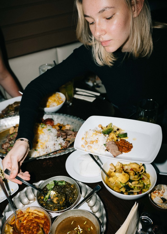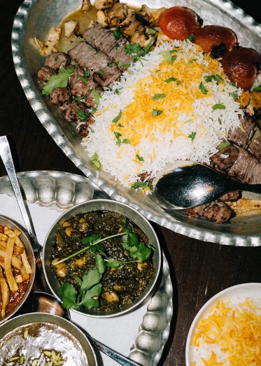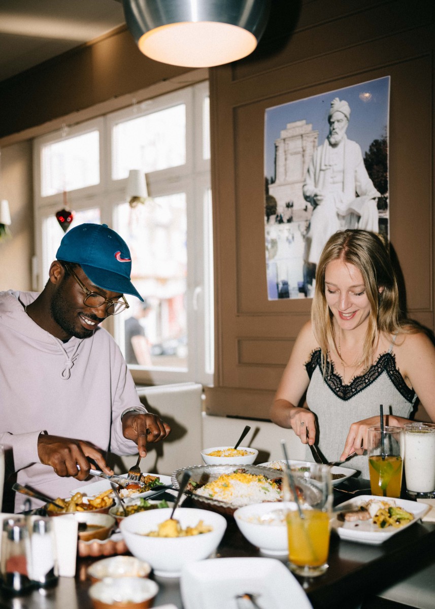„Safran ist ein komisches Gewürz, wortwörtlich“, lacht der Restaurantbesitzer und Küchenchef Akbar Delnavazi. Für das Gewürz, dessen weltweit größter Produzent seine iranische Heimat ist, hat Akbar einige Anekdoten parat – Disclamer: Dunkler Humor! „Safran hat einen stimmungsaufhellenden Effekt, aber wenn man viel zu viel davon zu sich nimmt, lacht man sich zu Tode. Früher haben sich unzufriedene Hausfrauen im Iran mit Safran überdosiert und sich wortwörtlich in den Tod gekichert.“ In Akbars Restaurant wird das iranische Gewürz selbstverständlich in absolut ungefährlichen Mengen zu den sieben Hauptgerichten hinzugefügt. Ganze vier Speisen davon sind vegetarisch und können auf Nachfrage auch vegan zubereitet werden. Statt den traditionellen Grillspießen mit Hack, Chicken, Lamm oder Rind können Kund:innen zur Granatapfelsauce, Walnüssen, Cashewkernen und Pistazien dann frische Champignons kombinieren. Für Veggies spricht der Restaurantbesitzer eine besondere Empfehlung aus: „Eine unserer Vorspeisen besteht aus Aubergine, Schafskäsesauce, speziell gerösteten Zwiebeln, Pistazien, Pfefferminz und Fladenbrot und wird von vielen Gästen auch als Hauptgericht bestellt.“ Nicht-Veggies legt Akbar die Koobideh ans Herz – im Iran ist der Spieß aus einer Mischung von Kalb- und Lammrippe das Nationalgericht mit einer Philosophie für sich. Laut dem Restaurantbesitzer fällt es Iraner:innen direkt auf, sollte die Koobideh nur marginal vom Traditionsrezept abweichen. Neben dem iranischen Nationalgewürz nutzt das Team in der Schloßstraße gerne auch Curry und Kurkuma – Safranreis wird allerdings als Beilage zu jedem Hauptgericht serviert.