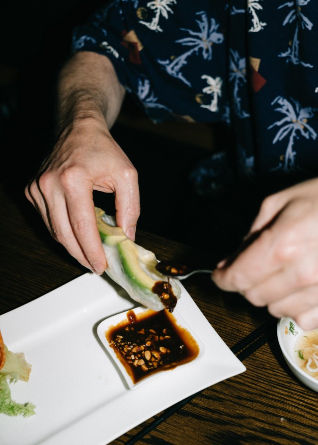 Wenn der rustikale Holztisch nur noch sporadisch zwischen den Schälchen, Schüsseln und Körben voller Leckereien durchschimmert, hat man im Huong Viet alles richtiggemacht. Der Name des Restaurants ist metaphorisch zu verstehen: „Huong bedeutet Geschmack, beziehungsweise Aroma“, verrät Frau Ngo, die Ehefrau des Inhabers Cuong Ngo. „Die Kulinarik und die Zutaten stammen aus vietnamesischen Dörfern, deshalb heißt unser Laden ‚geschmackliches Vietnam‘“. Und dieser geschmackliche Exkurs zieht sich durch den gesamten Besuch in der Presselstraße durch – langweilig wird es mit Black Tiger Garnelen, gegrilltem Zitronengras, Lotuswurzelstreifen oder gebackener Banane in keinem Fall! Besonders spannend im Huong Viet: Sowohl bei Vorspeisen, als auch beim Hauptgericht ist die vegane und vegetarische Auswahl riesig. So werden beispielsweise statt Hühnerfleisch, Rinderfilet oder Entenbrust bei den vegetarischen Optionen hausgemachtes Tofu oder Seitanwürfel zu den typisch vietnamesischen Veggies hinzugefügt. „Wir sind stolz, dass wir Gerichte komplett vegan anbieten können. Dabei arbeiten wir auf der Soßenbasis dann mit Soja oder fermentiertem Gemüse und wir verzichten auf die Fischsauce“, sagt Frau Ngo. Gemüse spielt im Huong Viet keine Nebenrolle, in Verbindung mit Reisnudeln oder Teigtaschen wird Rohkost zum unerwarteten Highlight und sorgt für die knackig-frische Haptik der Gerichte. Und auch wenn der altbekannte Spruch „Das Auge isst mit“ meist mit einem Augenzwinkern belächelt wird, ist die Dekoration der Gerichte im Huong Viet definitiv einer Erwähnung wert. Das Essen wird liebevoll mit Salat, frischen Kräutern wie Minze, Koriander oder asiatischem Basilikum garniert, Gemüseblumen auf den Tellern wirken nicht nur als Upgrade für das Auge, sondern auch für den Magen. Wer beim Zuhause-Kochen die Chilis lieber weglässt, ist beim Huong Viet ebenfalls an der richtigen Adresse: Der Geschmack ist eine angenehme Kombination aus würzig und fruchtig, die typisch süß-sauren Saucen sind auch für Nicht-Scharfesser:innen eine gute Wahl.