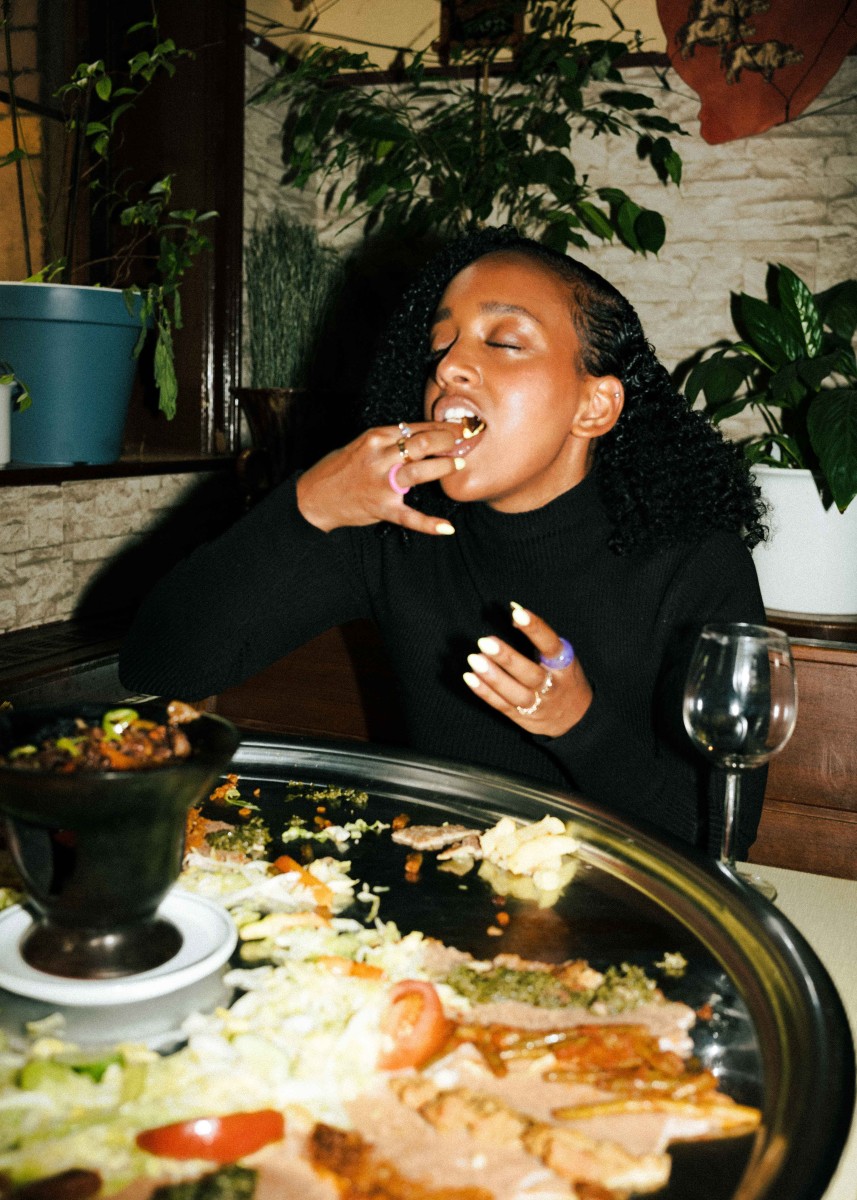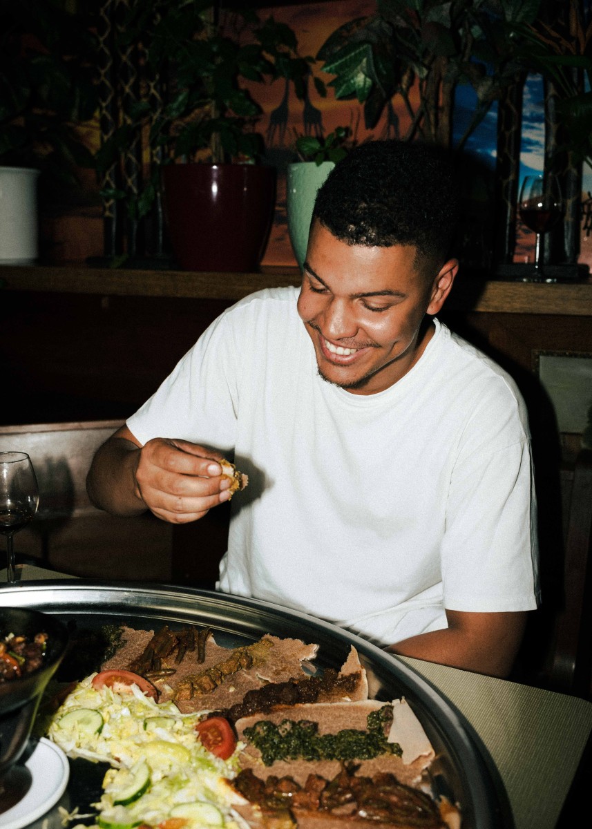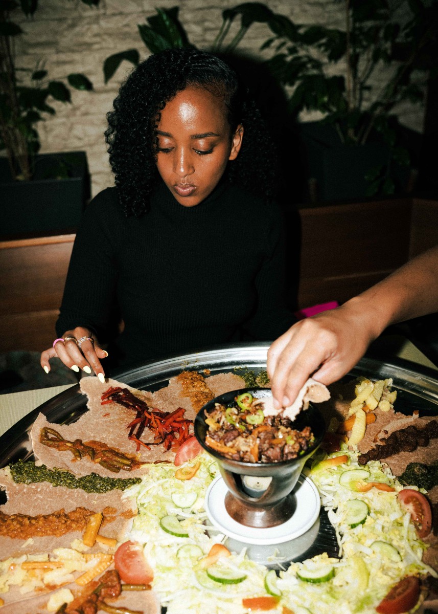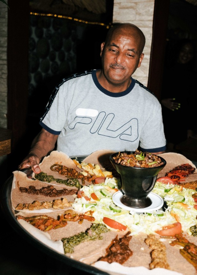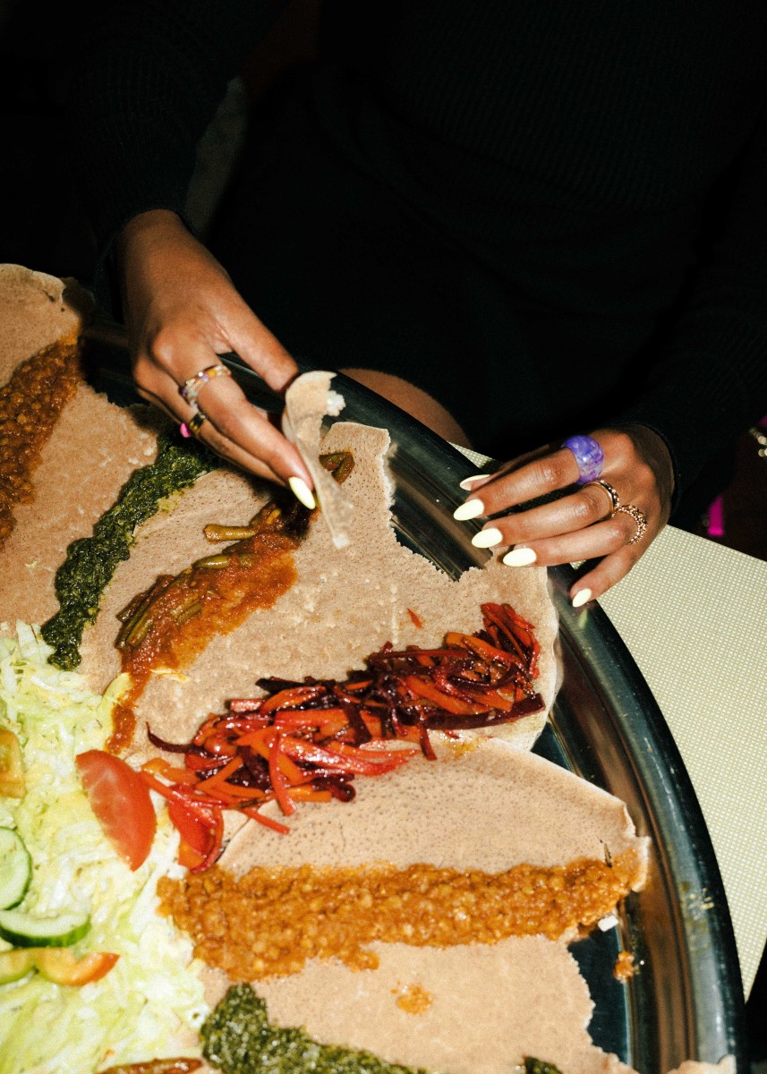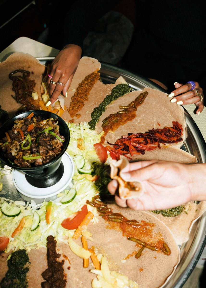 Teig ist nicht gleich Teig – was Küchenchef:innen bereits zu Beginn ihrer kulinarischen Ausbildung lernen, mag für den oder die ein oder anderen Food-Liebhaber:in Neuland sein. Denn neben Tortilla Wraps und Yufka-Fladenbrot gibt es einen weiteren Weltküche-Brothelden namens „Injera“. Das äthiopische Sauerteig-Fladenbrot unterscheidet sich von seinen Konkurrenten insbesondere in zwei Punkten: Einmal durch seine schwammartige Optik, aber auch durch die, in unseren Breitengraden, weitaus unbekanntere Zutat Teff. „Dabei handelt es sich um eine Getreideart, die es aufgrund von besonderen Klimabedingungen so nur in Äthiopien und Eritrea gibt“, erklärt der Restaurantbesitzer Mesafint. „Außerdem bedarf die Herstellung des Teigs etwas Übung“, schmunzelt er. Für den typisch-säuerlichen Geschmack gart dieser nämlich bis zu drei Tage lang. So wundert es nicht, dass seine Frau Mimi und er für die Zubereitung des äthiopischen Originals oftmals schon vor Ladenöffnung stundenlang in der Küche stehen und Injera verarbeiten. „Familienmitglieder und Freunde versammeln sich traditionell an einem Tisch, wir essen nämlich am liebsten gemeinsam“, berichtet der Besitzer, während er eine riesige (und sehr bunte!) Injera-Platte zu einem der vollen Tische trägt. Darauf befinden sich verschiedene Gerichte und Soßen: Entweder mit Fleisch oder als vegetarische/vegane Variante. Neben verschiedenen Rindfleisch-Kreationen wird auf der vegetarischen Seite vor allem mit Linsen, grünen Bohnen und gebratenem Spinat experimentiert. Was ein bisschen an „Toppings“ erinnert, heißt im Äquator „Wot“ und steht für die typischen Fleisch- und Gemüseeintöpfe, die man zusammen mit dem Injera isst. Und die machen auch optisch etwas her! Noch nie war das Sprichwort „Das Auge isst mit“ so passend wie hier. Bunte und liebevoll angerichtete Teller sind bei Mesafint und Mimi eben ein absolutes Muss! Die ultimative Äthiopien-Experience verspricht das Essen übrigens selbst: Denn Injera wird herkömmlich mit der rechten Hand gegessen. Bye bye, Besteckchaos.