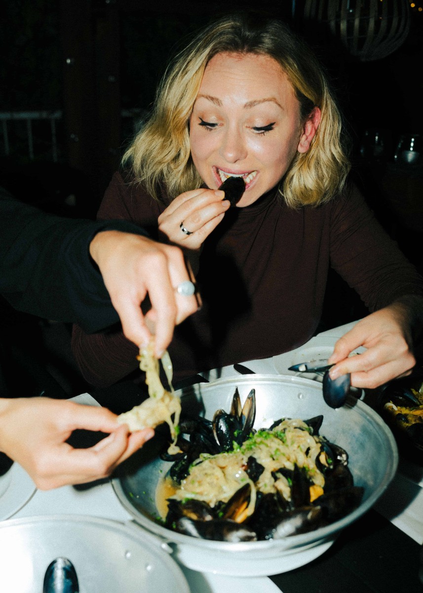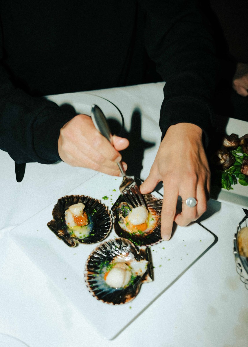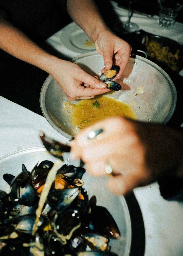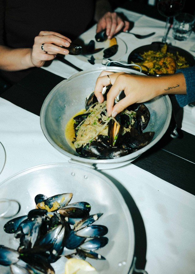 Pesce oder Veggie? Aioli oder Zitrone? Pimientos oder Oliven? Die südeuropäische Küche ist unumstritten die beste Kulinarik für entscheidungsunfreudige Menschen. Stichwort: Tapas! „Das Konzept der kleinen Dishes ist einfach“, sagt Robin Hackh, dessen Eltern das Tasca im Feui vor über dreißig Jahren eröffnet haben und der inzwischen als treibende Kraft im Hintergrund des Restaurants tätig ist. „Viel Bestellen, jeder nimmt sich etwas und wenn du nicht satt bist, bestellst du einfach nochmal. Zum Beispiel selbstgemachte, frittierte Sardinen, Garnelen in Knoblauch-Zitronen-Weißweinsoße oder einfach eine Portion wilde Kartoffeln.“ Im Gegensatz zu den bunt gemischten Tapas bleibt die Auswahl an Hauptspeisen bei Tasca im Feui komprimiert – mit Absicht. Robins Mutter Lola hat die Rezepte aus ihrem Heimatland Portugal mit nach Deutschland gebracht und sie mithilfe ihrer eigenen Mutter verfeinert. Lolas Küche steht für Qualität statt Quantität, wer Lust auf Fisch mitbringt, wird bei Familie Hackh besonders fündig. Gegrillte Dorade, Thunfisch Steak, gekochter Stockfisch, Miesmuscheln oder Seezunge lassen die Herzen von Meeresfrüchteliebhaber:innen schneller schlagen. Der Geheimtipp für die ultimative Tasca-im-Feu-Experience? Paella oder Schweinefleisch mit Venusmuscheln vorbestellen! „Beides sind typisch portugiesische Gerichte“, erklärt Robin. „Letzteres wird auch in der Paella-Pfanne angerichtet, die Kartoffeln sind kleingeschnitten und werden zusammen mit Venusmuscheln und Fleisch serviert. Das mag ich persönlich sogar noch lieber als die Paella.“ Abgesehen von leckeren Desserts wie dem offiziell-inoffiziell portugiesischen Weltkulturerbe Pasteis de Nata empfiehlt es sich, auch die Starters nicht zu unterschätzen – insbesondere das hausgemachte Aioli ist eine Offenbarung. „Danach sollte man aber kein Date mehr haben“, lacht Robin.