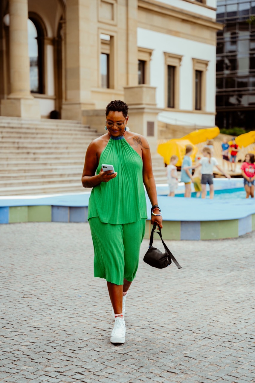 Frisch gestärkt geht’s weiter mit der U-Bahn Richtung Charlottenplatz. Nur eine Station und schon sind wir da. Hier befindet sich das städtische Museum StadtPalais, die Location für Jennifers geliebtes BitchFest. Auf den Treppen gibt sie Einblicke, was es damit genau auf sich hat: „Das BitchFest ist ein Festival für badass Women and their Girls, eine große Party mit Workshops, Panels, Live-Musik und mehr. Die Idee dazu hatte ich bereits vor der Pandemie – allerdings sah das Festival damals in meinem Kopf noch ganz anders aus.“ beginnt sie. „Es sollte sich, wie viele andere Events, die Female Empowerment feiern, vor allem an Gründerinnen und Unternehmerinnen richten. Während der Pandemie bin ich allerdings in ein großes Loch gefallen, eine Lebenskrise, die mir jeglichen Mut genommen hat. Dadurch habe ich mich selbst stark verändert – und ebenso meine Vision vom BitchFest. Heute ist es mir besonders wichtig, dass es sich eben nicht nur an Gründerinnen und Unternehmerinnen richtet, sondern an alle Frauen. 77 Prozent der Frauen sind keine Unternehmerinnen. Meine Schwester ist Erzieherin, meine Mutter war Krankenschwester. Die haben auch Female Empowerment verdient! Female Empowerment orientiert sich oft zu sehr an der Leistung von Frauen – nur Erfolge zu feiern, finde ich heute zu oberflächlich.“ Und wie kommt’s zum einschlägigen Namen? Mit dem Wort Bitch habe sie schon immer gerne gespielt und sich auch selbst so bezeichnet. „Eine Bitch ist für mich eine Frau, die für sich selbst einsteht, die den Raum mit ihrer Präsenz füllt, die keine Angst hat, ihre Wünsche zu äußern und sie einzufordern, auch auf die Gefahr hin, damit anzuecken. Ich hasse es, in Stereotypen zu sprechen – deswegen ist das nur meine eigene Erfahrung: Ich habe den Eindruck, dass es Frauen immer noch schwieriger fällt, ihre Bedürfnisse auszusprechen und einzufordern. Das ist etwas, das mir schon immer leicht fiel und das ich mir für viel mehr Frauen da draußen wünsche, angefangen bei meiner Tochter.” Jennifer Reaves ist selbst Mutter. Im Gespräch lässt sie immer wieder durchblicken, dass es auch die Beziehung zu ihren beiden Kids ist, die Einfluss auf ihre Entscheidung gehabt hat. Deshalb ist es beim BitchFest auch explizit gewünscht, dass Mütter das Festival mit ihren Töchtern besuchen können. Ein ganzer Tag voller Workshops, Talks und Entertainment – ein besseres Bonding-Programm kann es ja wohl kaum geben!